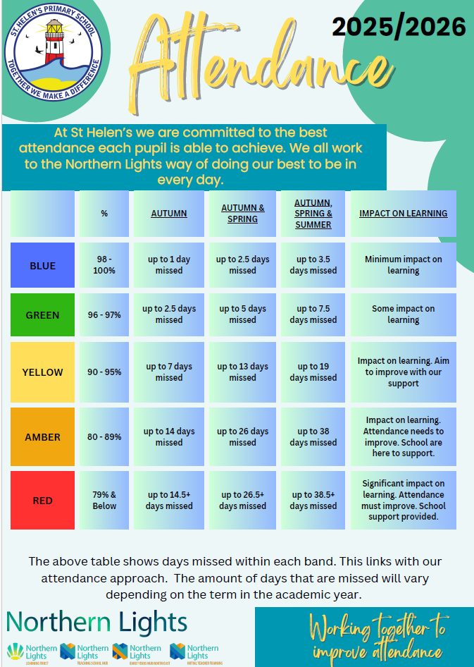 The poster below demonstrates the impact attendance has on your child's learning. It also shows, as a school, how we support you when attendance falls below a specific level. This is so that every child can achieve their best attendance.